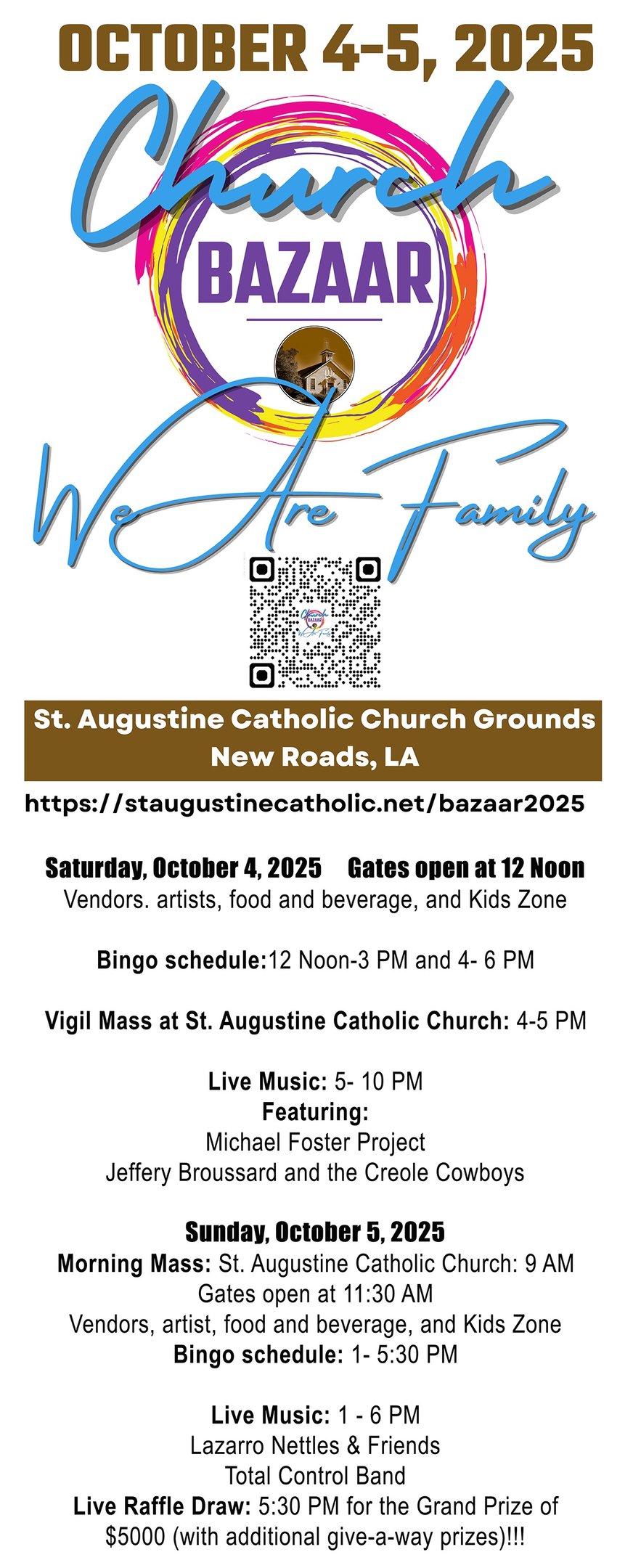On behalf of the St. Augustine Catholic Church family in New Roads, Louisiana, I humbly extend this greeting to inform you of our upcoming Bazaar, an old-fashioned Church Fair, titled: We Are Family. The event will take place on Saturday, October 4 – Sunday, October 5, 2025 and will be held on the church grounds.
